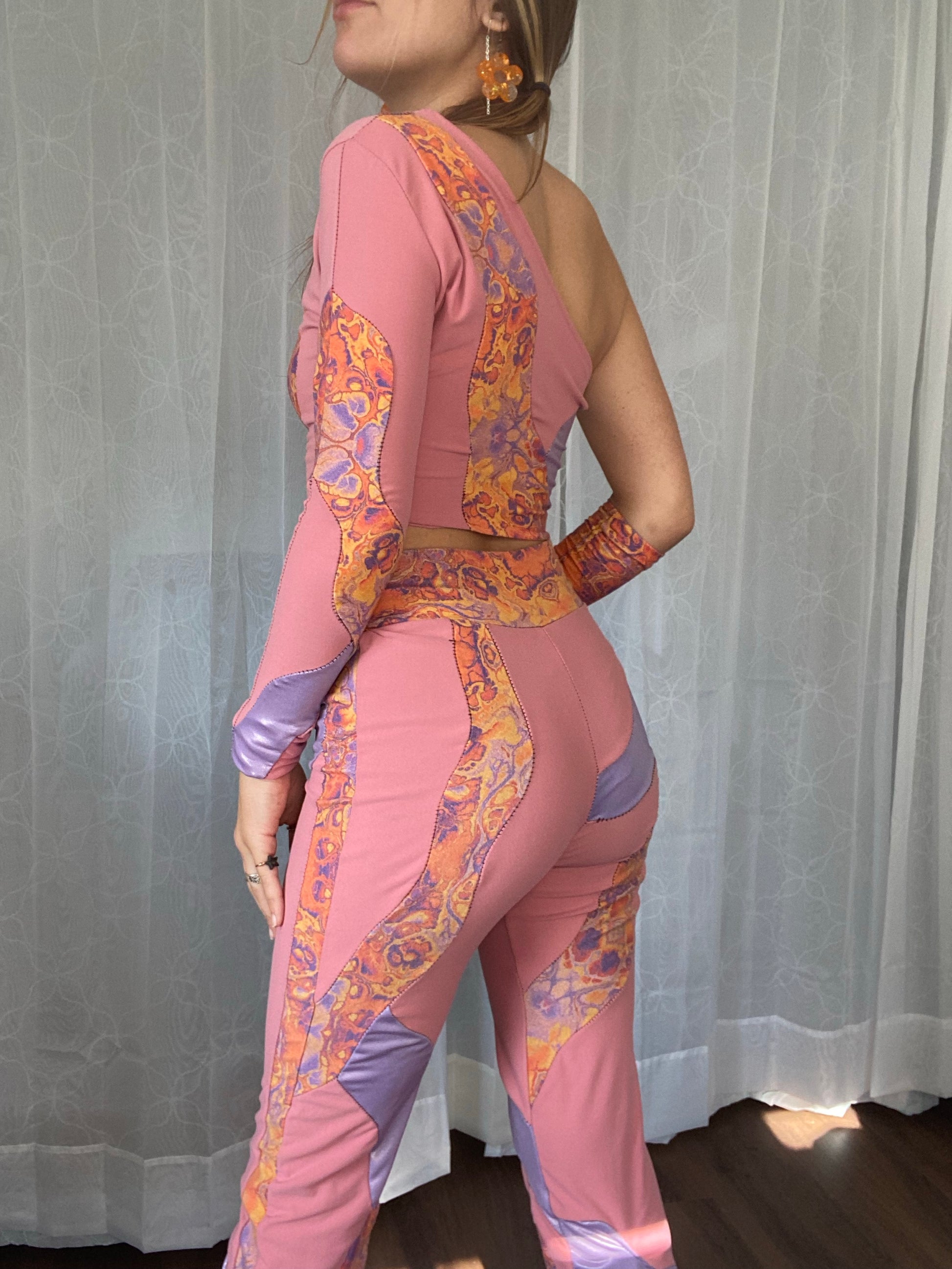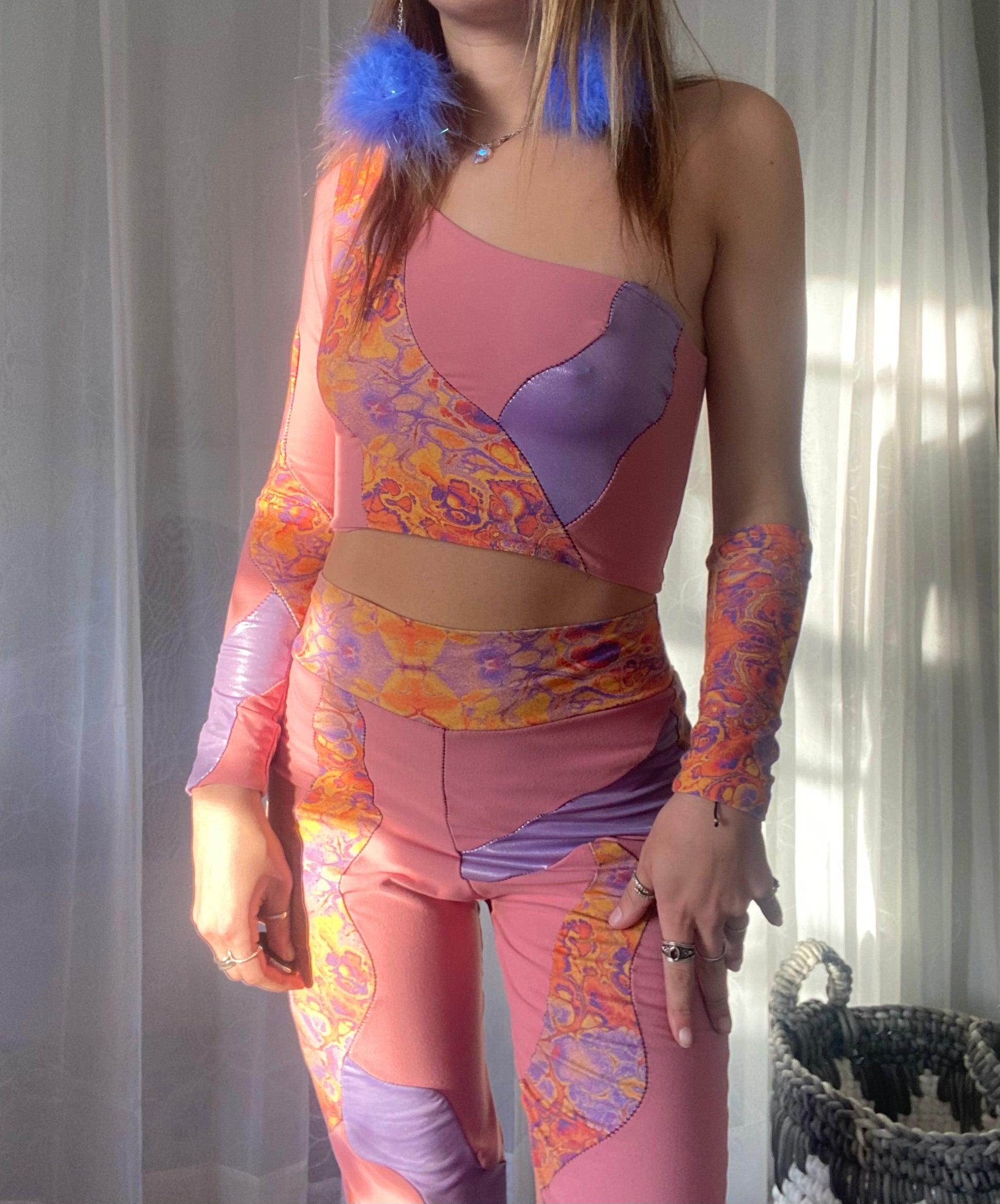 includes one shoulder top, arm sleeve, and matching pants