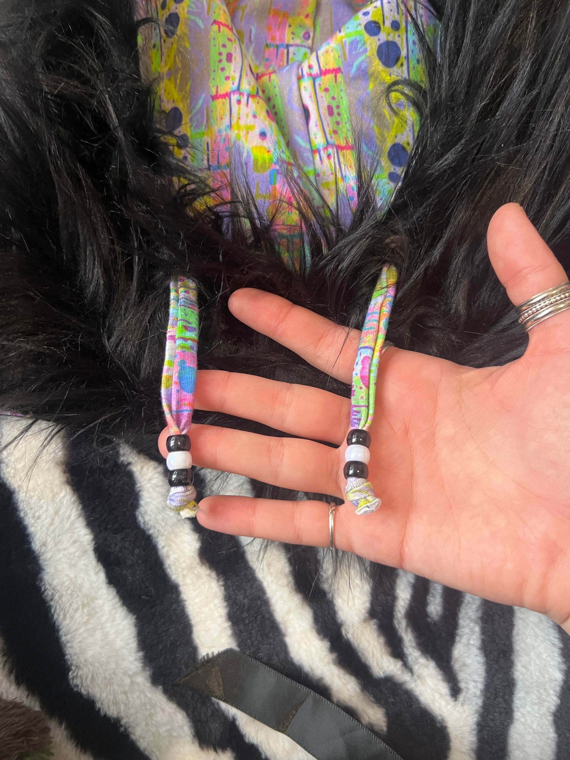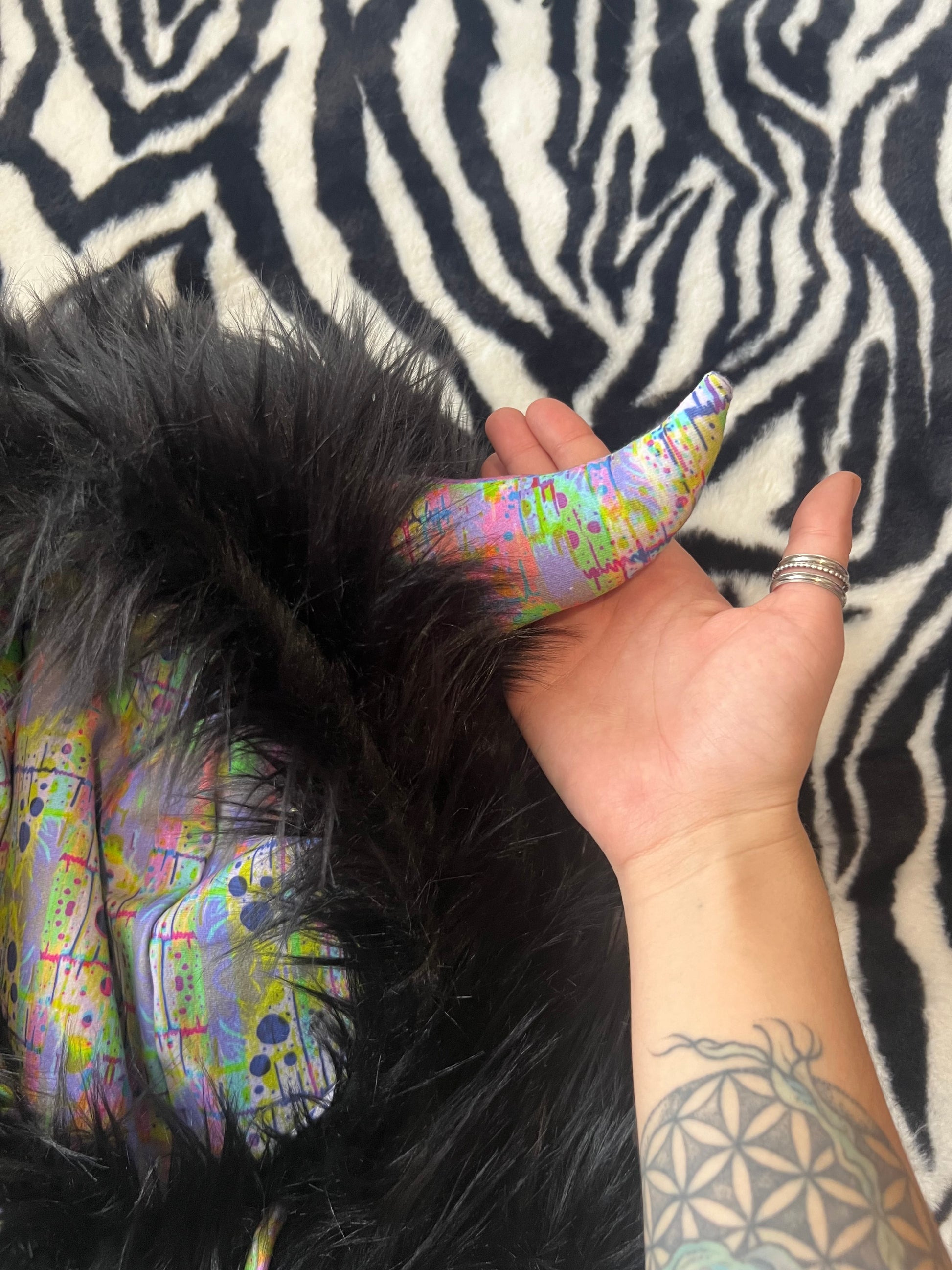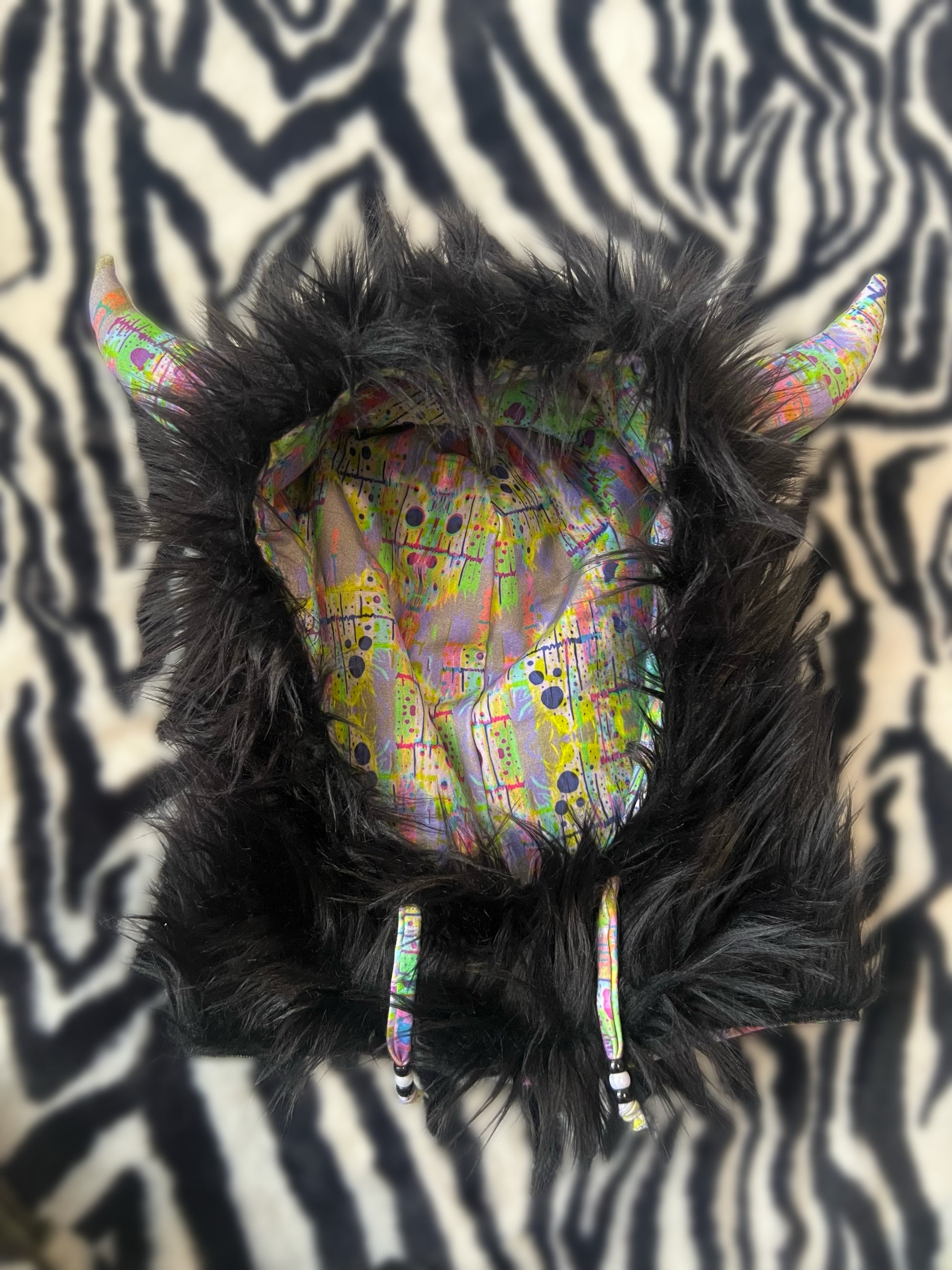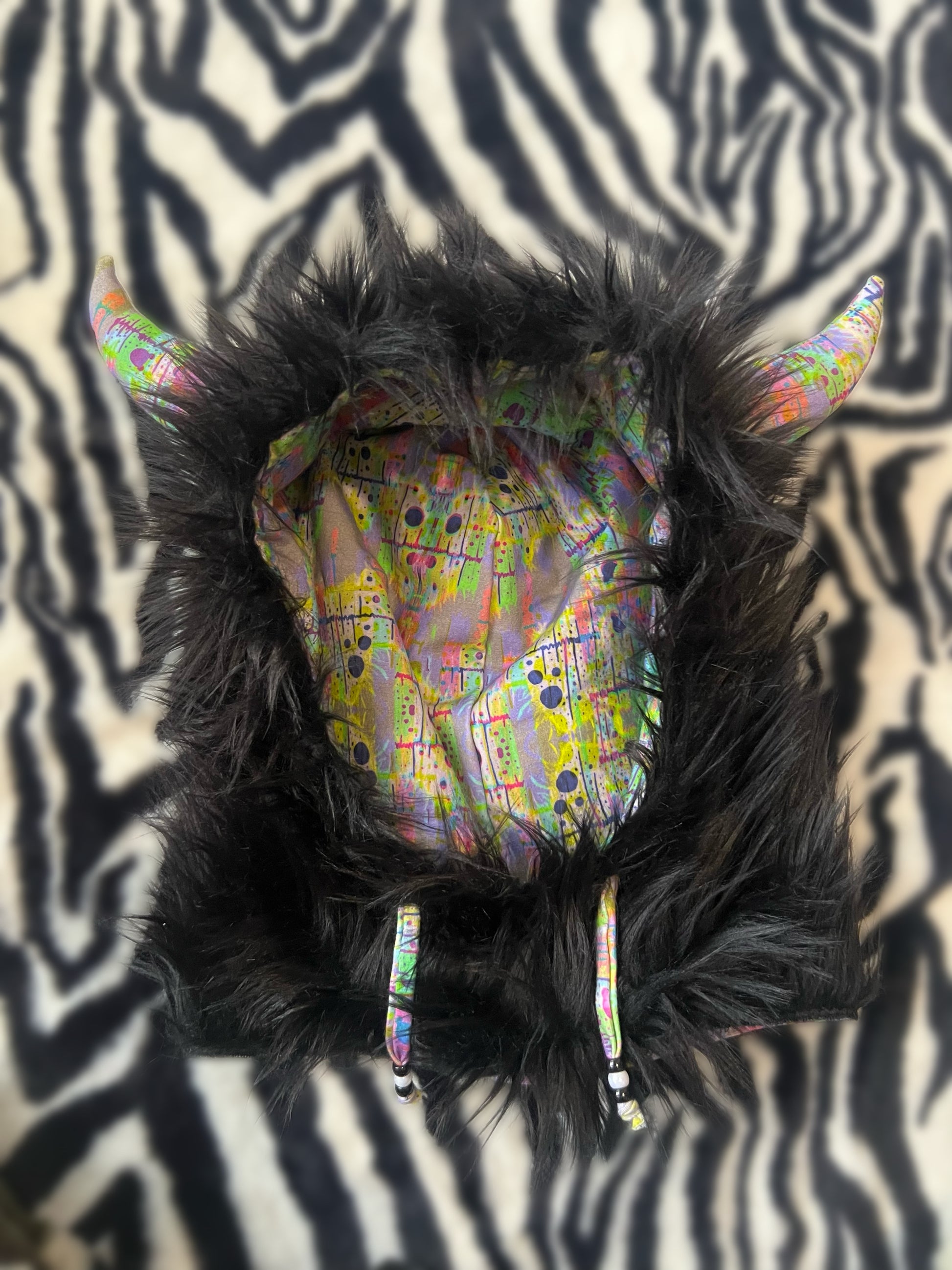 faux fur with cotton spandex lining & mega bull horns