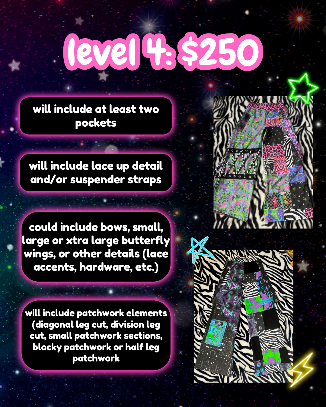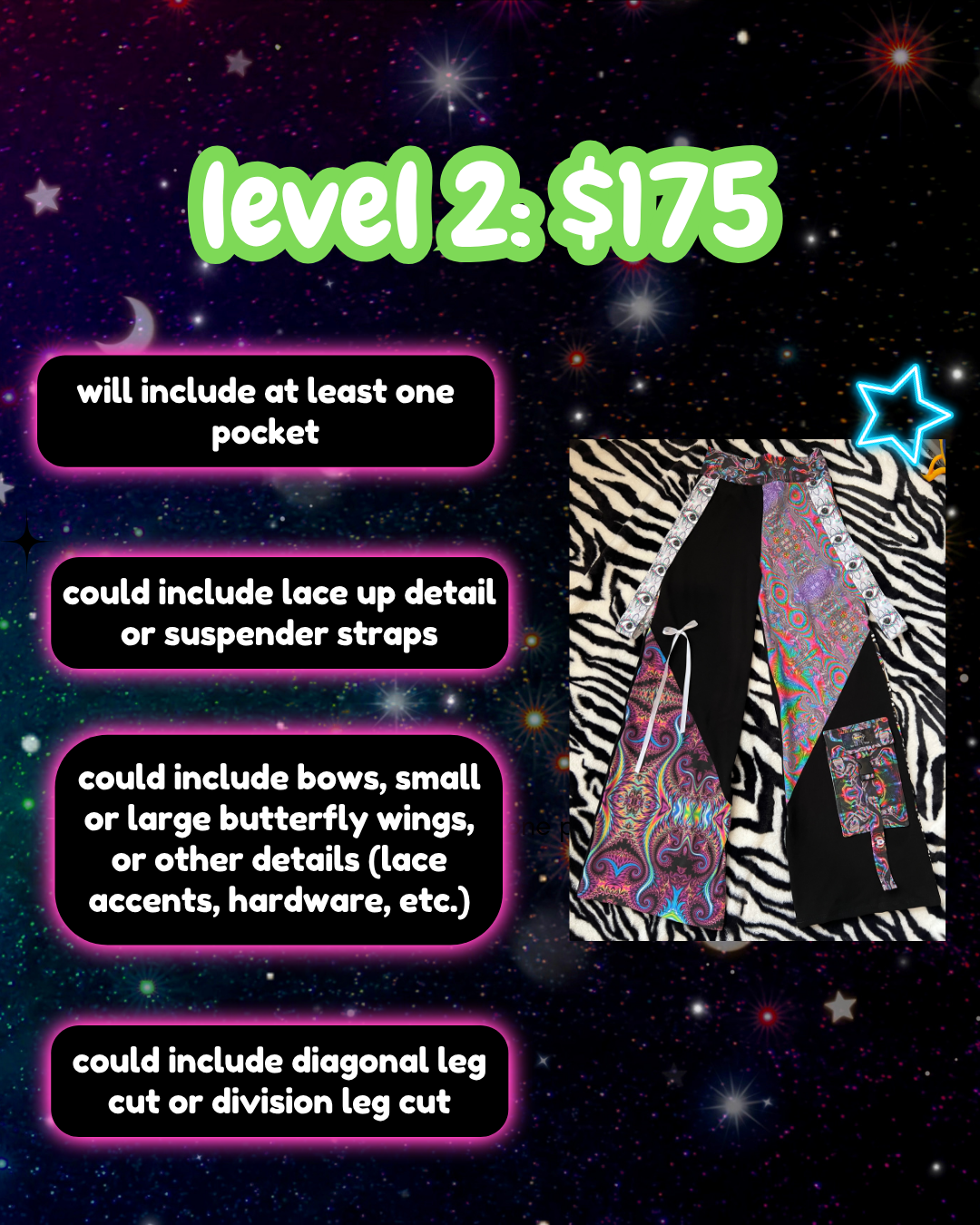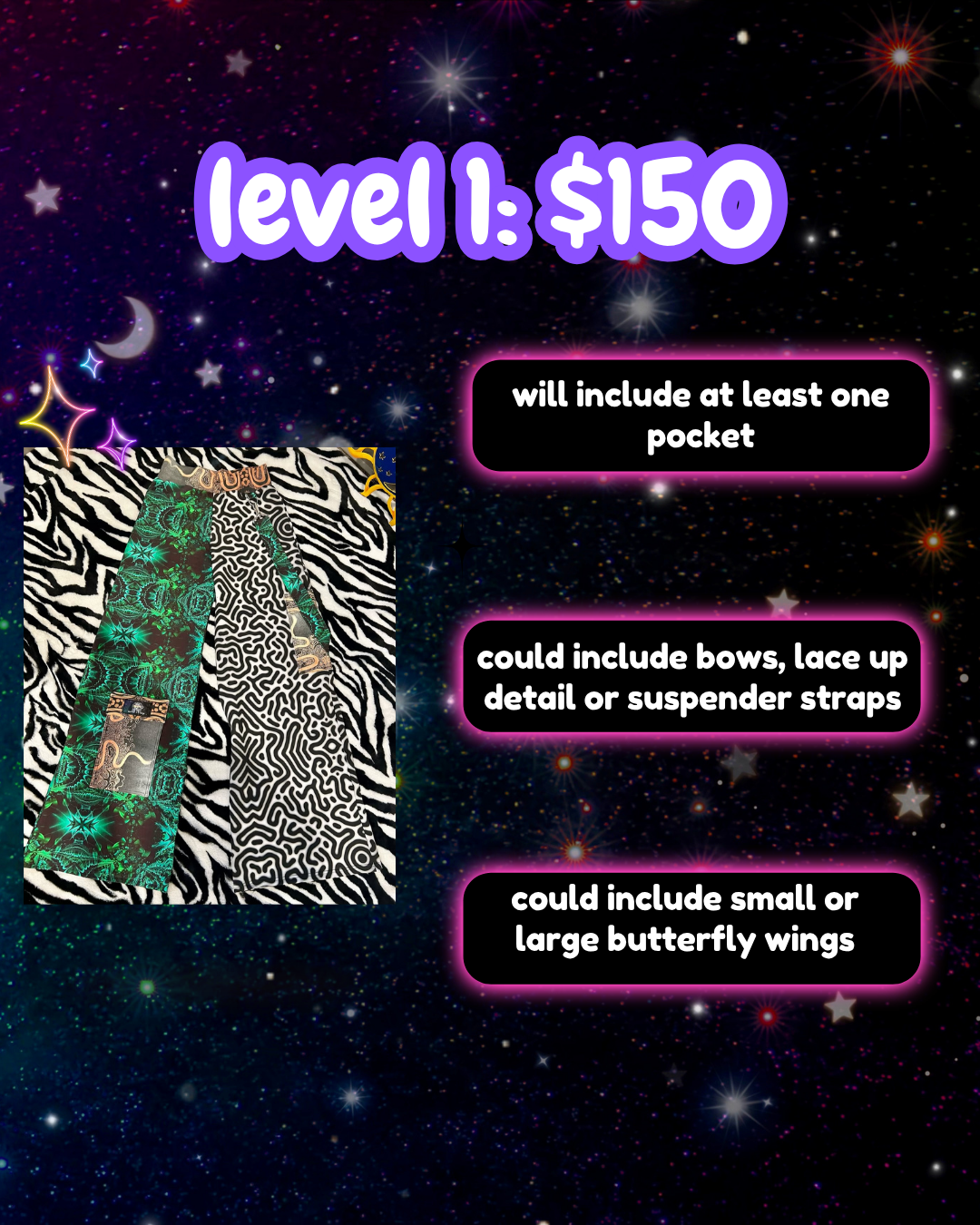introducing mystery cargos!! where everything is ~artist choice~ you can give me an overall vibe you like or don't like in terms of colors/patterns. i.e. i don't like pink, i mainly wear blues, i like trippy patterns or more subtle patterns but the overall design will come straight from the heart and remain a mystery until you receive them<3 all cargos will be the wide leg style as pictured!